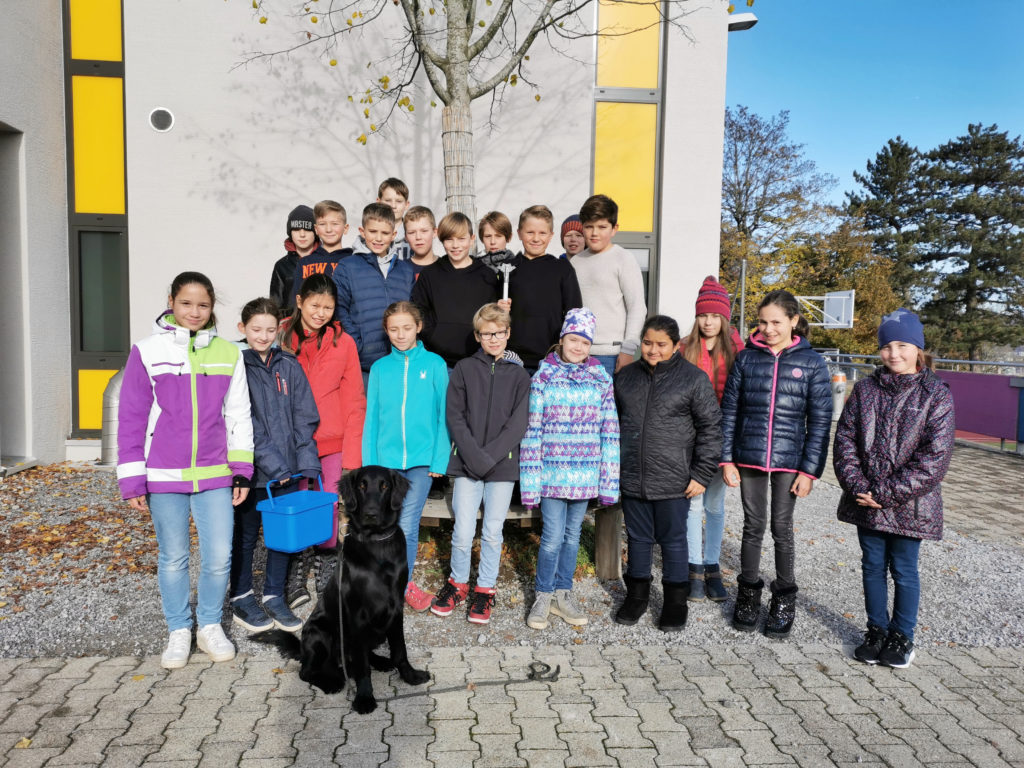 Deshalb hat sich die Klasse 5a entschieden, ab den Sommerferien jeden Dienstag nach der grossen Pause auf einem Rundgang über den Pausenplatz Abfall einzusammeln. Deswegen machten sich immer drei Kinder und Frau Theiler mit Takeshi auf den Weg. Sie brauchten dafür Handschuhe, Eimer und Abfallzange. Zurück im Klassenzimmer wurde besprochen, was eingesammelt wurde. Leider fand man sehr viel Plastikverpackungen, Znünireste und sogar Zigarettenstummel. Auch wenn euch mal etwas runterfällt bitte hebt es wieder auf, das würde uns sehr freuen.
