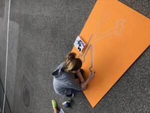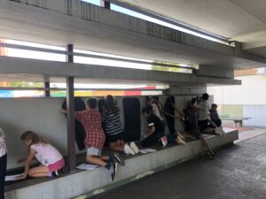 So besuchten die Schülerinnen und Schüler gemeinsam mit ihrer TTG Lehrerin im August die Unterführung, um sich vor Ort ein Bild darüber zu machen, wie die alten Bilder aussahen und um sich für die Farben der neuen Kunstwerke zu entscheiden. Danach gings ums Vorbereiten der Bretter: gar nicht so einfach war es, die riesigen Stücke zu transportieren, zu schleifen, zu grundieren. Das Ganze wurde draussen gemacht und so wurde mal geschwitzt, mal windete es so stark, dass der Abdeckplastik und sogar die Bretter nie an Ort und Stelle blieben…