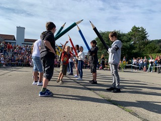 Am Montag, dem 9. August war es so weit! Die neuen Erstklässlerinnen und Erstklässler standen zurechtgemacht mit ihren in allen Farben leuchtenden Schulranzen bereit fürs alljährliche Einschulungsritual. Geführt von ihren neuen Lehrerinnen Carol Habermacher und Melanie Hug, konnten die 38 Schülerinnen und Schüler um Punkt 9 Uhr auf dem mit Sonnenblumen geschmückten Pausenplatz Einzug halten.